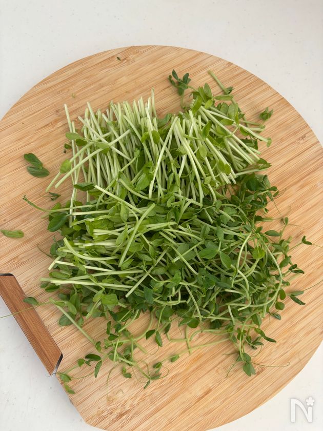 (1) 豆苗は5cm幅に切る。