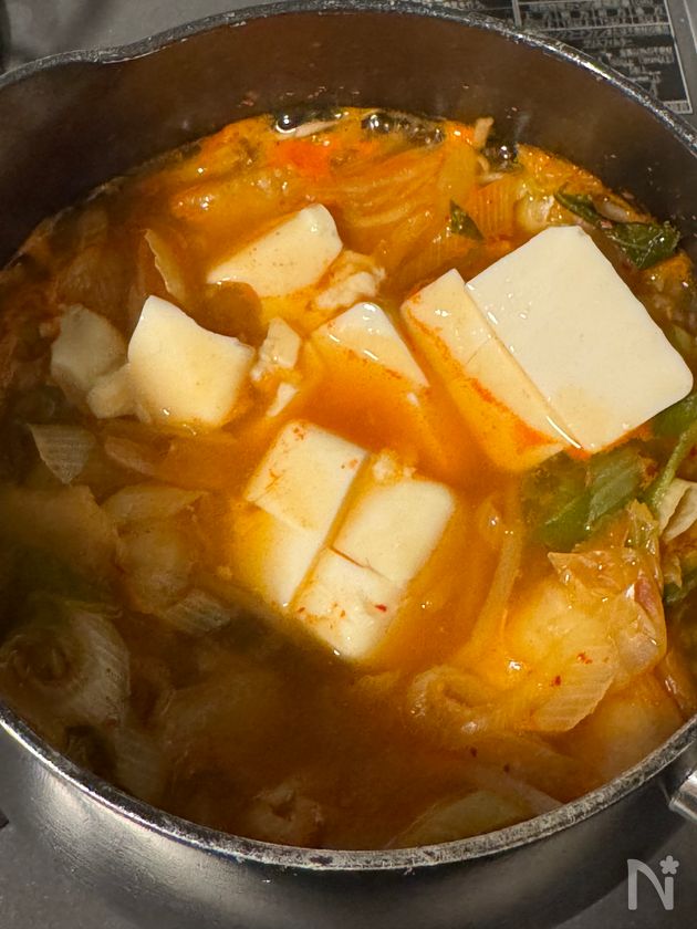(3) ネギがくたっとしたら、豆腐(絹)と【A】を入れて1分ほど、煮込んだら完成です。