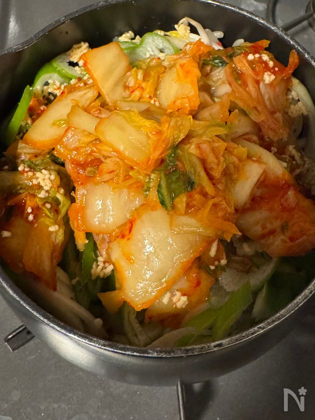 (2) 鍋にもやし、ネギ、キムチを入れて、鶏がらスープの素と水を入れて煮込む。