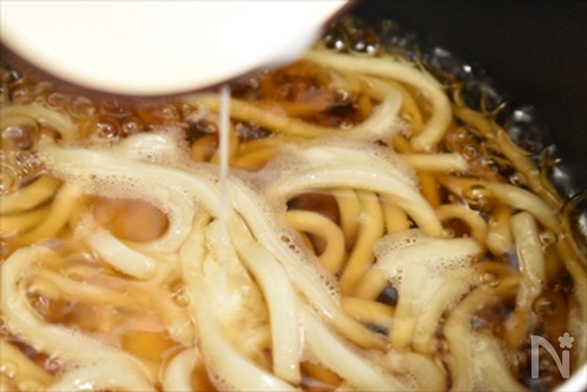 (2) 鍋に【A】を入れて沸かし1を加えて加熱し、よく混ぜた【B】を加えてとろみをつける。
