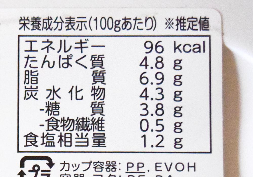 100gあたり96kcal・たんぱく質4.8g・脂質6.9g・炭水化物4.3g・食塩相当量1.2gです。