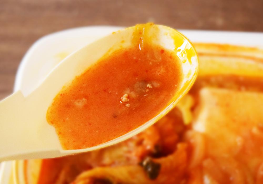 辛さはほんのり感じる程度で、全体としてマイルドなスープです。キムチの酸味がほどよく混ざり合い、まろやかな味わいに仕上がっています。「チゲ」と聞くと辛いイメージがありますが、ローソンの「チゲ」はそのイメージとはほど遠くマイルドで、意外性があります。
