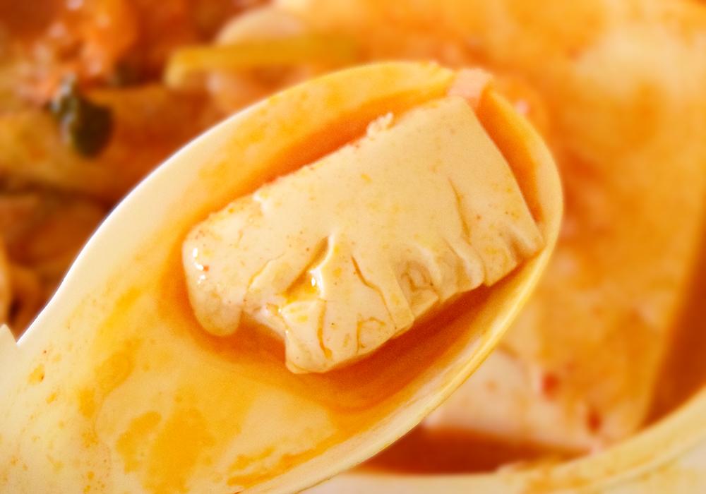 貝・エビ・牛肉の旨みがきいたスープが特徴。唐辛子の辛さもしっかりと感じられるタイプのスンドゥブチゲです。なめらか豆腐も入っています。