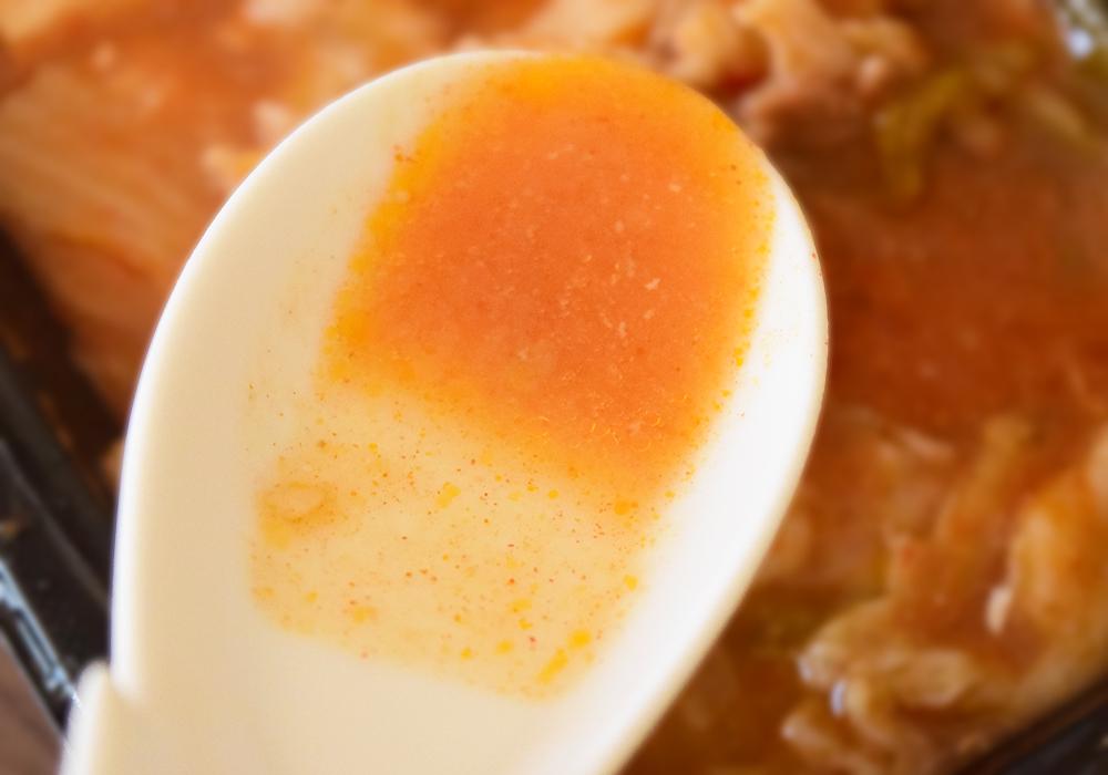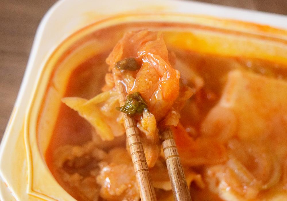 唐辛子のピリッとした刺激はしっかり感じられるものの、ファミリーマートのチゲほどの強い辛さではありません。スープには野菜や豚肉の旨味が溶け込み、白菜キムチの軽やかな酸味が後味を引き締めています。
