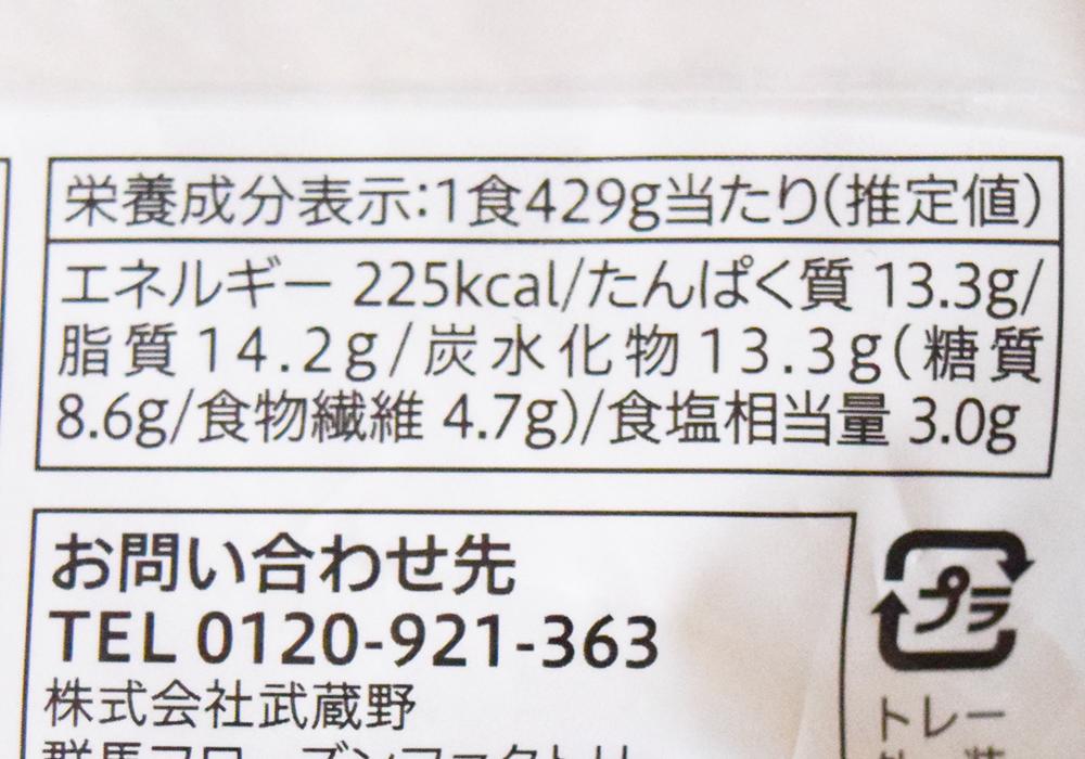 1食429gあたり225kcal・たんぱく質13.3g・脂質14.2g・炭水化物13.3g・食塩相当量3.0gです。