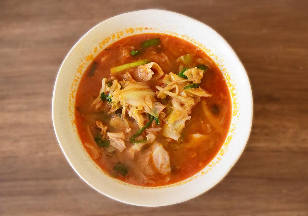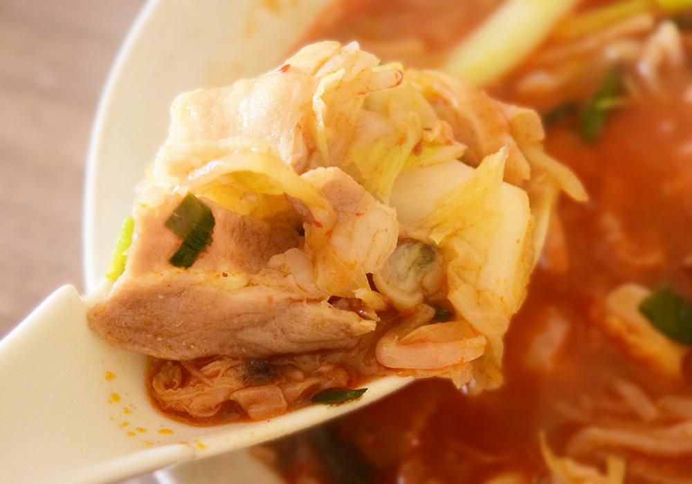 唐辛子の辛さがビリビリと舌を刺激し、強烈な辛味が印象的です。今回食べ比べた3品の中でも、群を抜いて辛さが際立っています。スープにはキムチや白菜、あさりなどの旨味もしっかり染み込んでいますが、それ以上に辛さが前面に出ていて、とても刺激的な味わいに仕上がっています。