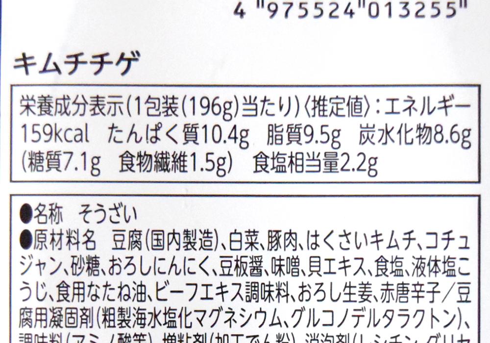 1袋196gあたり159kcal・たんぱく質10.4g・脂質9.5g・炭水化物8.6g・食塩相当量2.2gです。