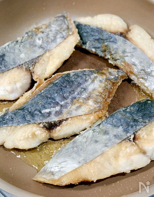 (1) フライパンに油大さじ3を入れ、中火(170℃)で熱する。鰆の皮目から入れ、両面じっくり焼き色をつける。