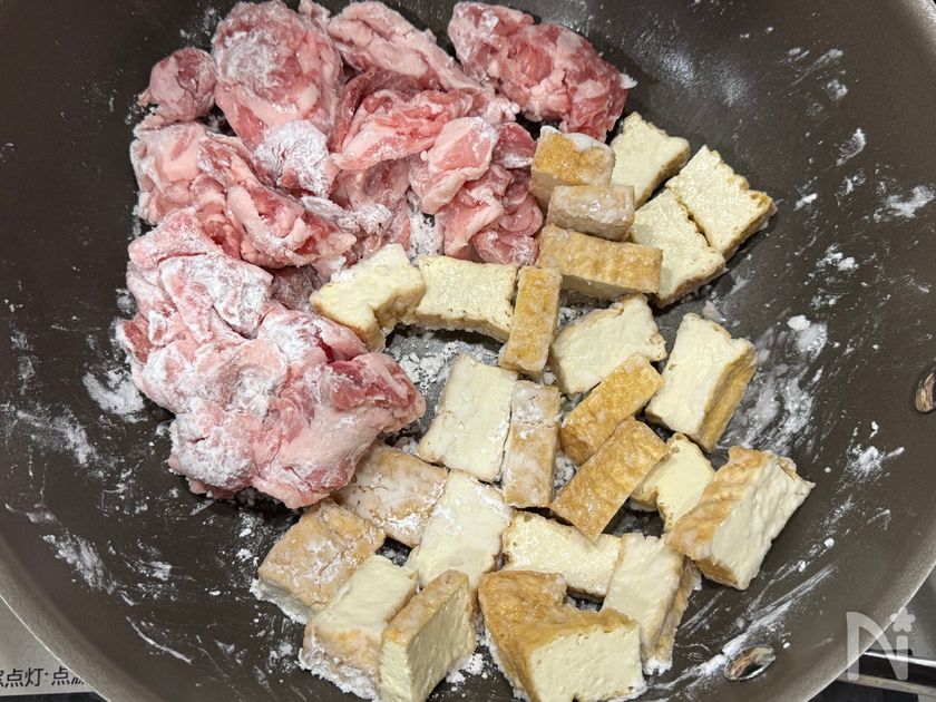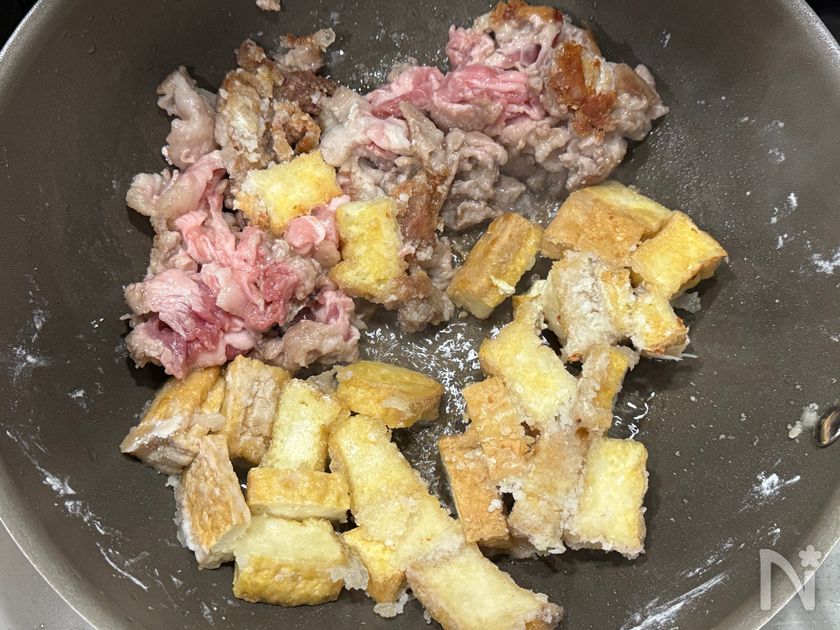 (2) フライパンに豚こま切れ肉厚揚げをいれ、片栗粉をまぶす。