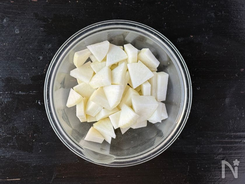 (下準備) 大根は5mm幅のいちょう切りにする。
