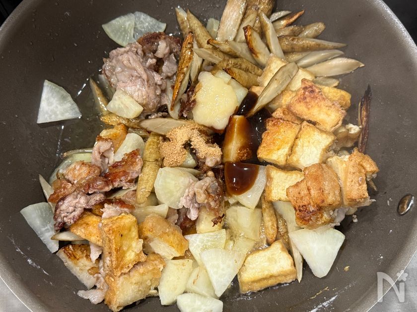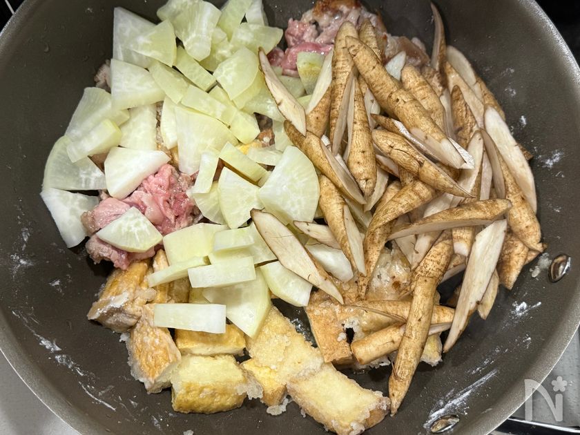 (5) 大根とごぼうに焼き目がついたら、【A】を加える。