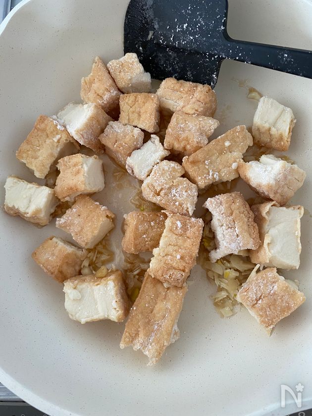 (1) ごま油をひいたフライパンを熱し、にんにく・生姜を中火で炒め、香りがたったら絹揚げを加えて、1分ほど炒める。