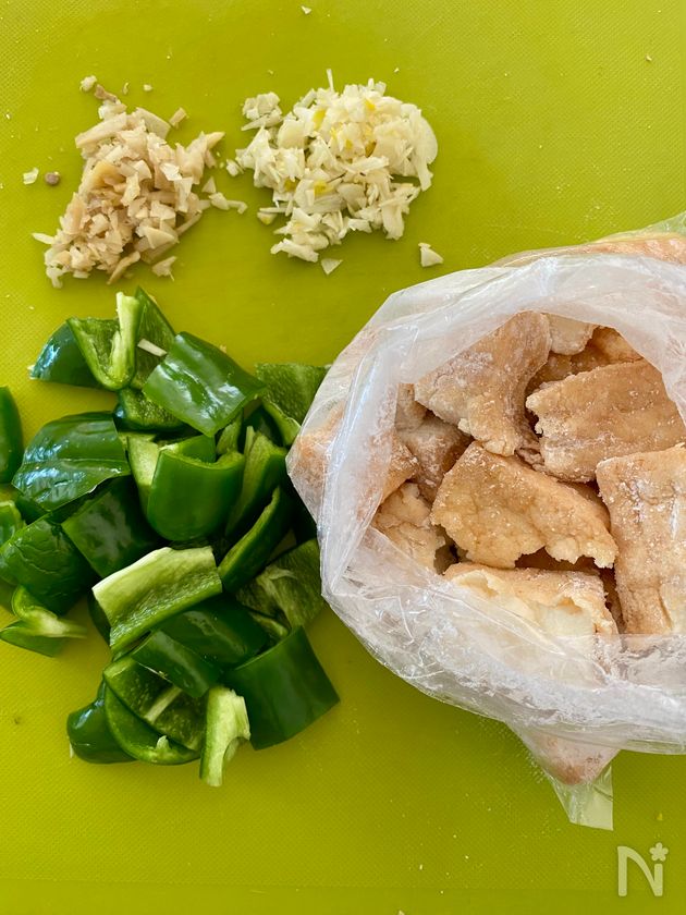 (下準備) ピーマンは種とヘタを取り除き、ザク切りにする。