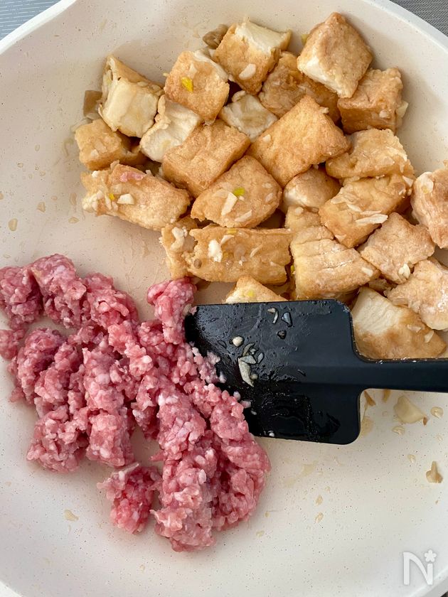 (2) 絹揚げをフライパンの端に寄せ、空いているところに豚ひき肉を入れる。中火で2分ほどひき肉を炒める。