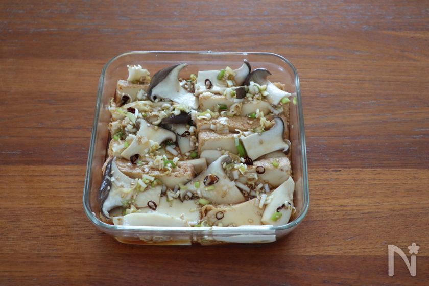 (3) 2に1の絹揚げ(厚揚げ)とエリンギを入れて、半日以上漬け込む。