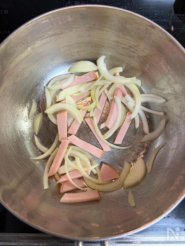 たまねぎ・ハムを入れ、たまねぎがしんなりするまで炒める。