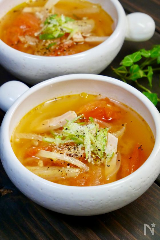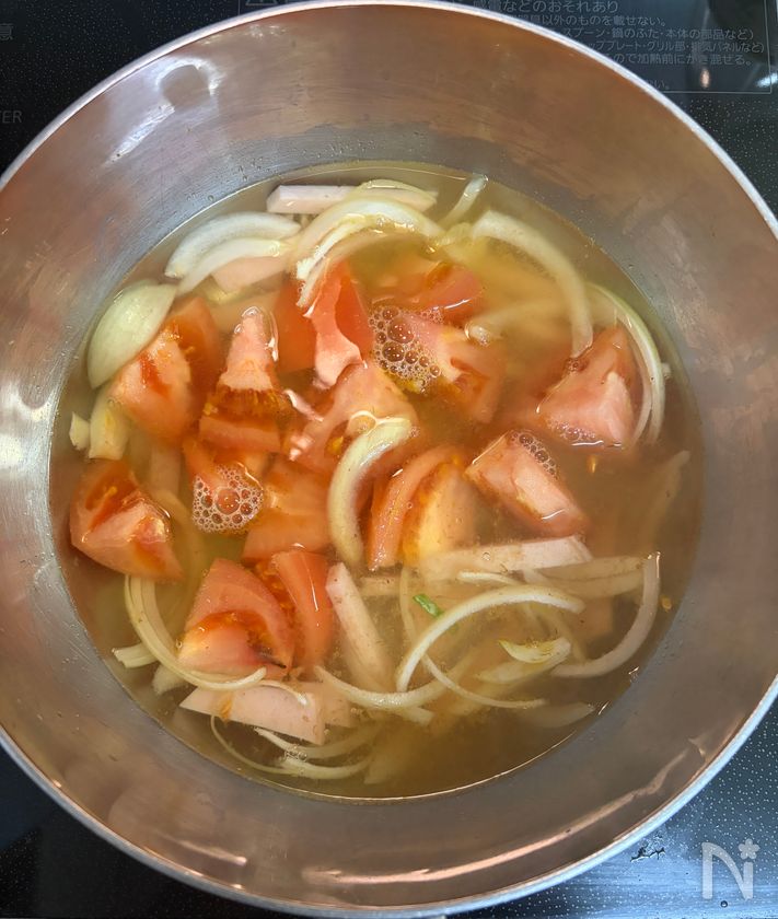(2) 出し汁を加えてひと煮立ちさせ、トマトを入れて1〜2分温める。
