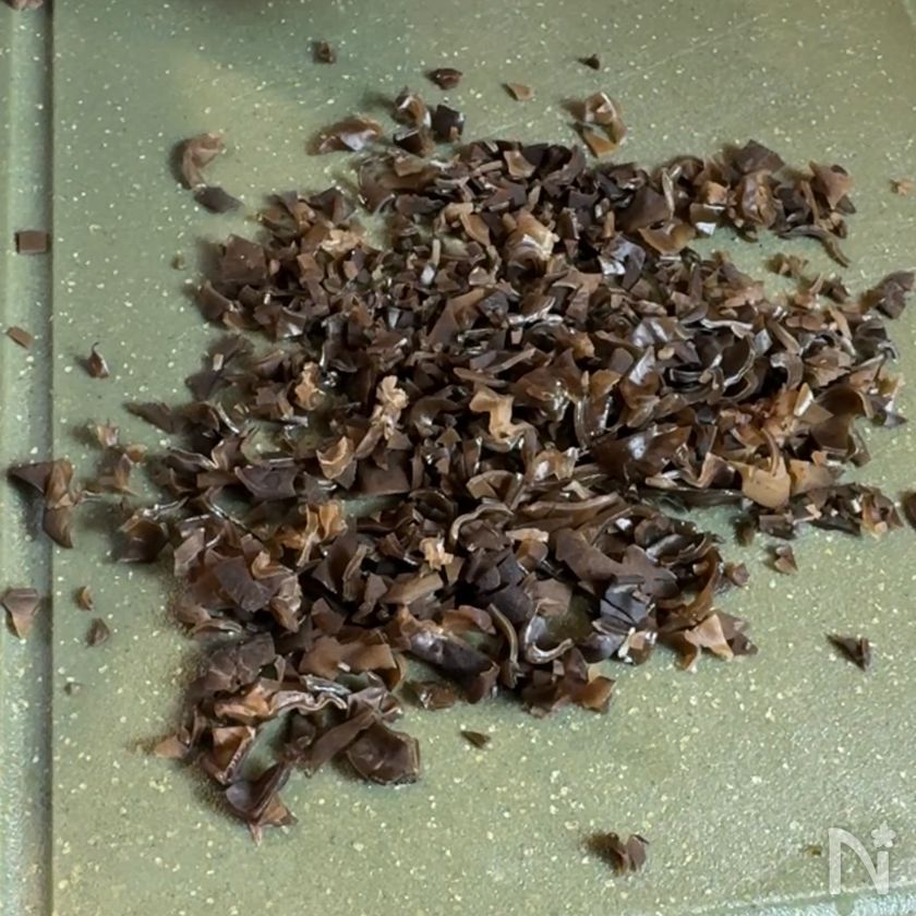 (1) 乾燥キクラゲを水で戻し、水気を切って粗みじん切りにする。