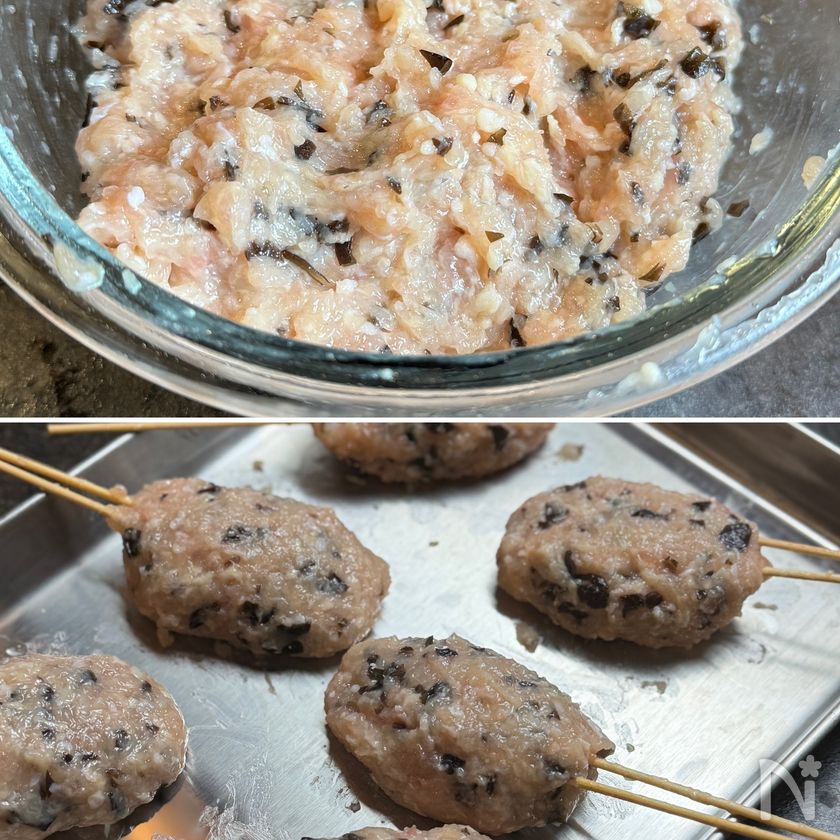 (2) ボウルに鶏ひき肉と1を入れ、【A】を加えてよくこねる。ざっと6等分にし、竹串2本に包むように楕円形に成形して、同じものを6個作る。