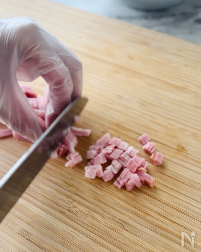 (2) ベーコンは8mm角に切る。