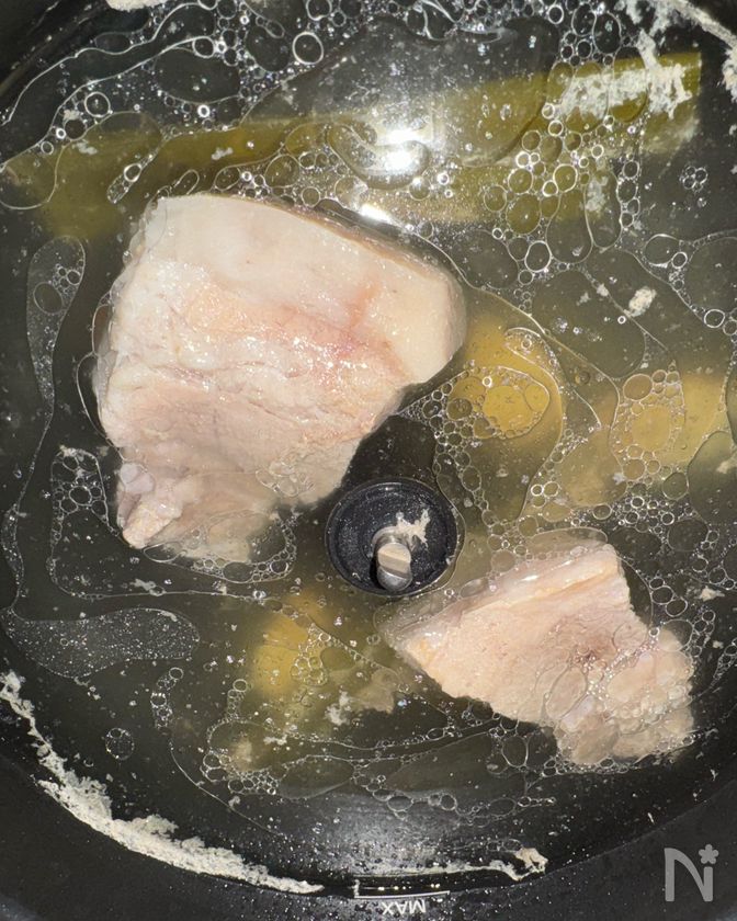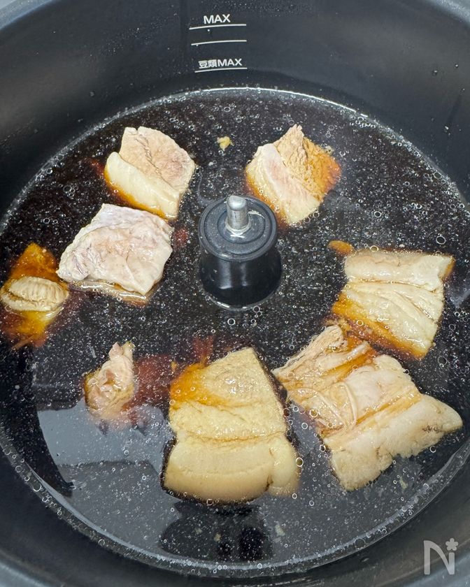 (6) 圧力鍋に食べやすく切った豚バラ塊肉と【A】を加え、蓋をして高圧で15分加圧する。