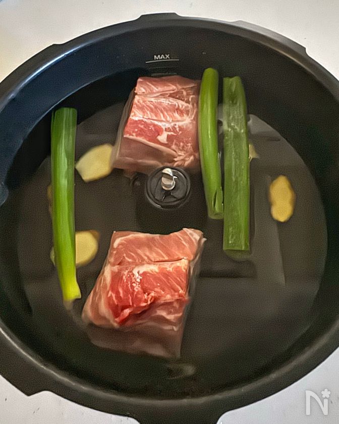 (3) 圧力鍋に豚バラ塊肉、長ねぎの青い部分、生姜を入れて肉がかぶるくらいの水(記載外)を入れる。