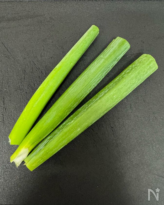 (1) 長ねぎの青い部分は、土が入り込んでいる場合があるので、重なっている部分を外してきれいに洗う。