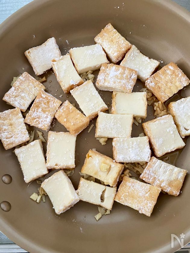 (下準備) 絹揚げは厚さ半分のひと口大に切り、片栗粉をまぶす。