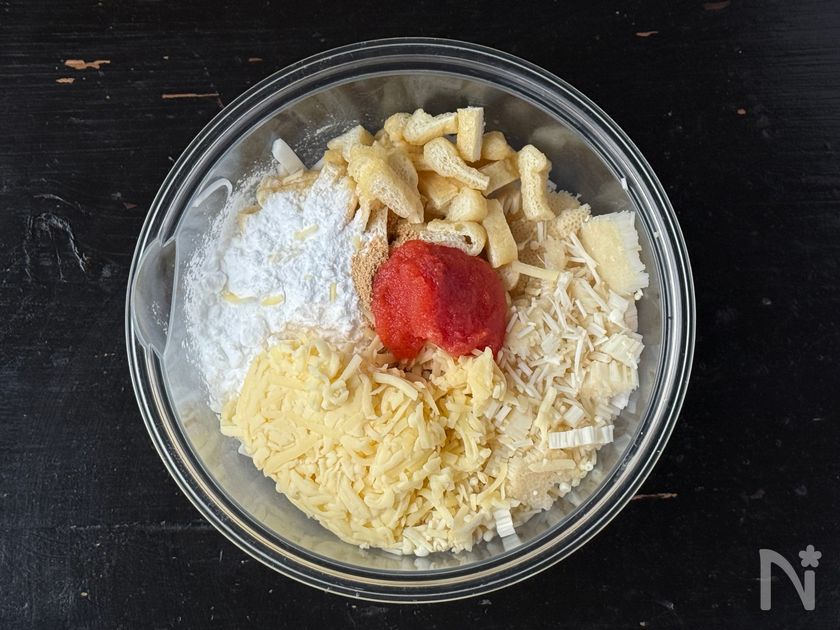 (1) ボウルにかぶ、えのき茸、油揚げ(正方形)【A】を入れる。