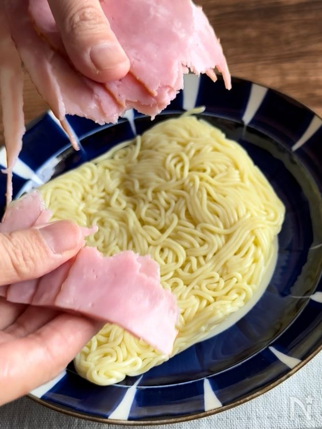 ◎電子レンジで3分加熱するだけで、パスタ風焼きそばが完成!