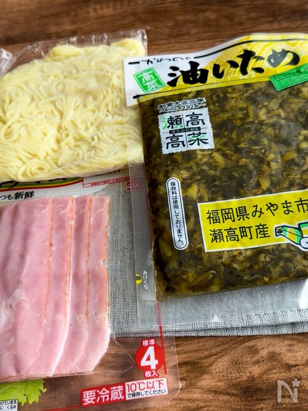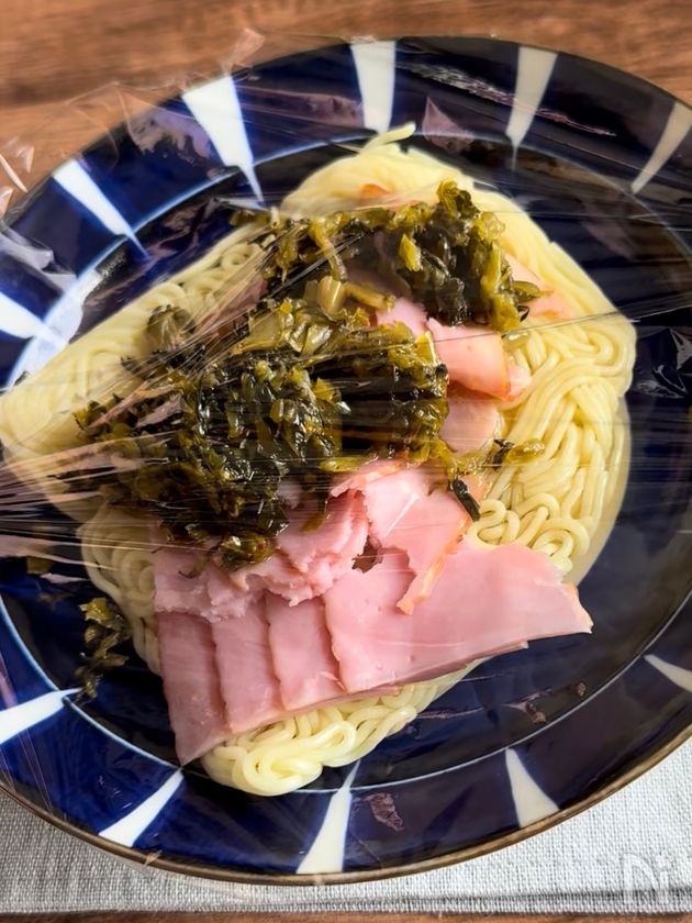 (1) 耐熱用の盛り付け皿に焼きそば麺を入れ、手でちぎったハーフベーコンと高菜油炒めをのせる。