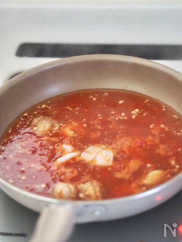 (2) にんにくの香りが立ったら中火にし、【A】とシーフードミックスを加える。