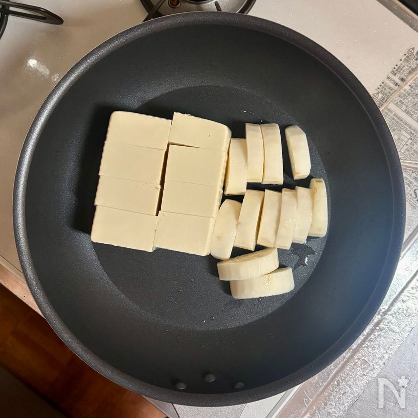 長芋は皮をむいて1cm厚さの半月切りにし、同じフライパンに加える。