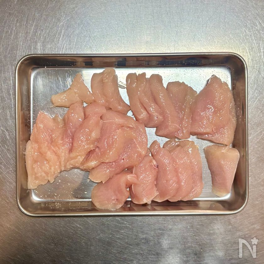 (1) 鶏むね肉は皮を除いて8mm厚さ、3.5cm大のそぎ切りにし、【A】をふって10分ほどおく。