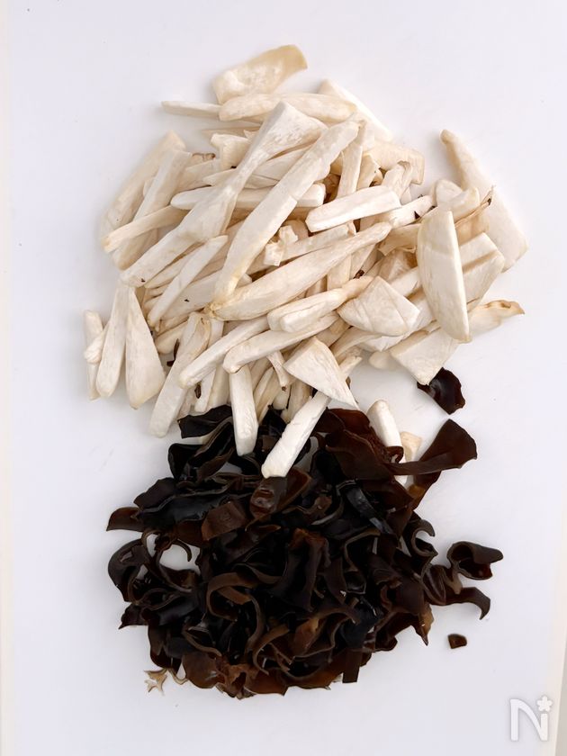 (1) きくらげ、エリンギは、石づきを取り、細切りにする。