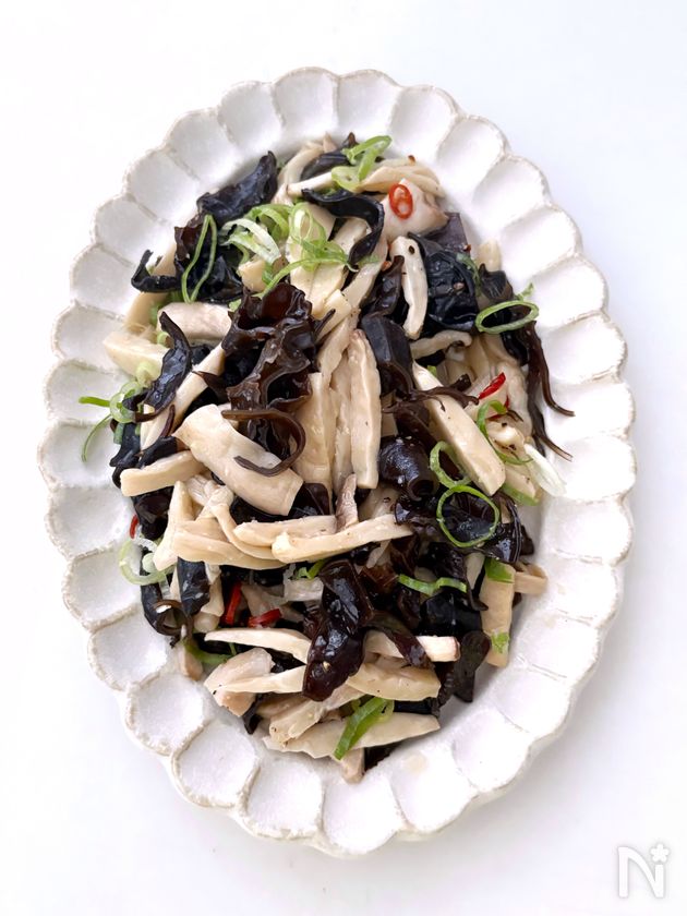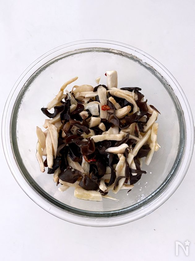 (2) 耐熱ボウルに、きくらげ、エリンギ、【A】を入れ、混ぜ合わせたら、ふんわりラップをかけて、電子レンジ500Wで、2分加熱する。