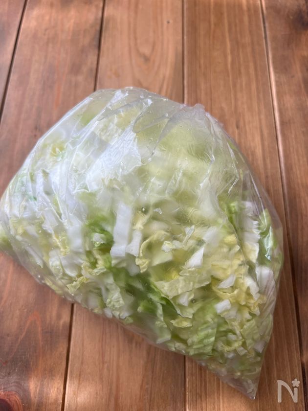 (1) ・白菜は細切りにしポリ袋に入れる。塩を入れシャカシャカと振り全体に塩を馴染ませたら5分ほどおき、しっかり水気を絞る。
