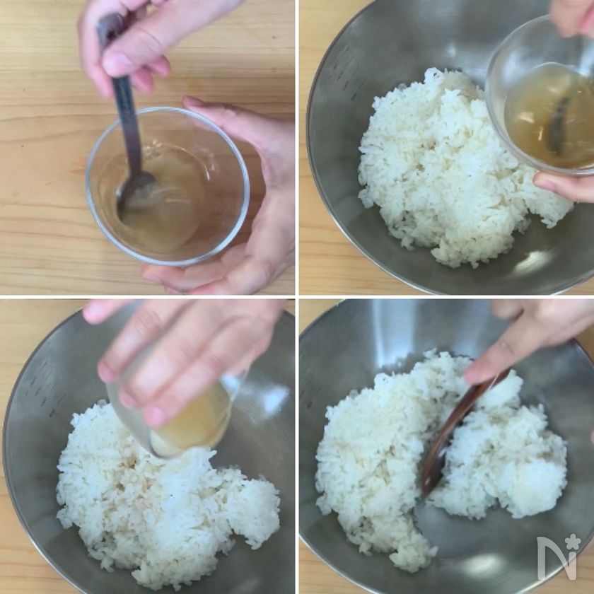 炊きたてのごはん1合に加えしゃもじてわ切るように混ぜ合わせる。