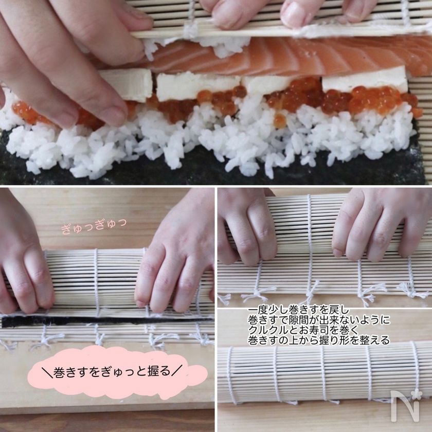 •巻きすで寿司をクルクルと巻く
