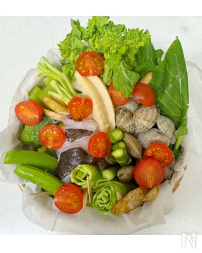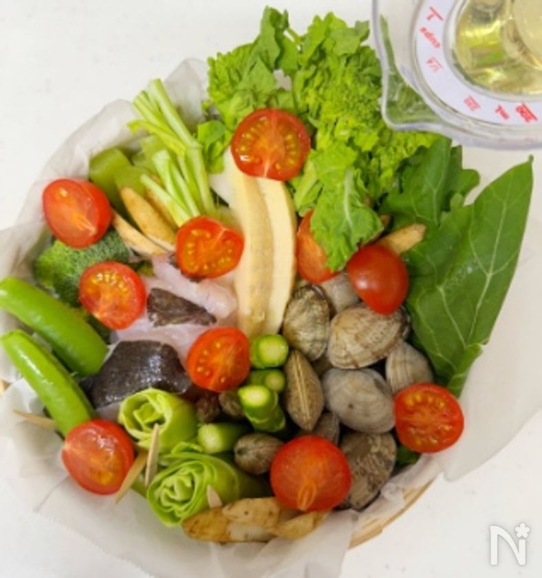 (6) 具材(野菜とあさり、生たら切り身)をオーブンシートを敷いたせいろに詰める。