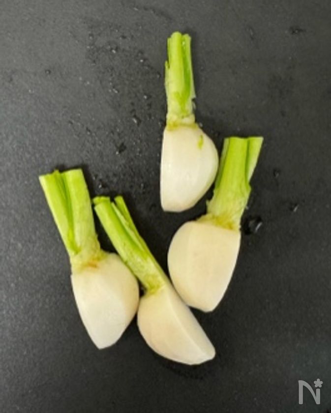 (3) 蕪は茎を3cm残して1/4に切る。葉は食べやすく切る。