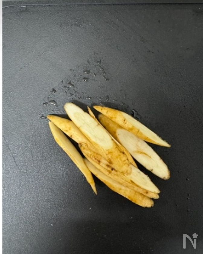 (2) ごぼうは斜め薄切りにして、酢(記載外)と水を合わせたものにさらし、水気を切る。
