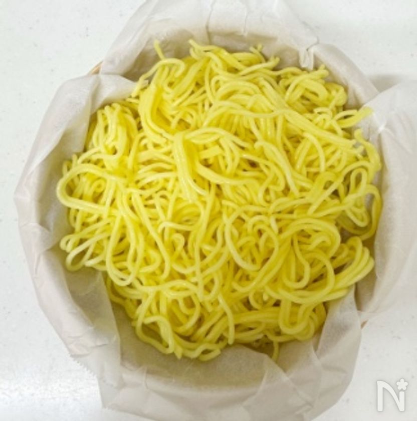 (8) もう1つのせいろにオーブンシートなどを敷き、蒸し麺(焼きそば用蒸し麺)を広げる。