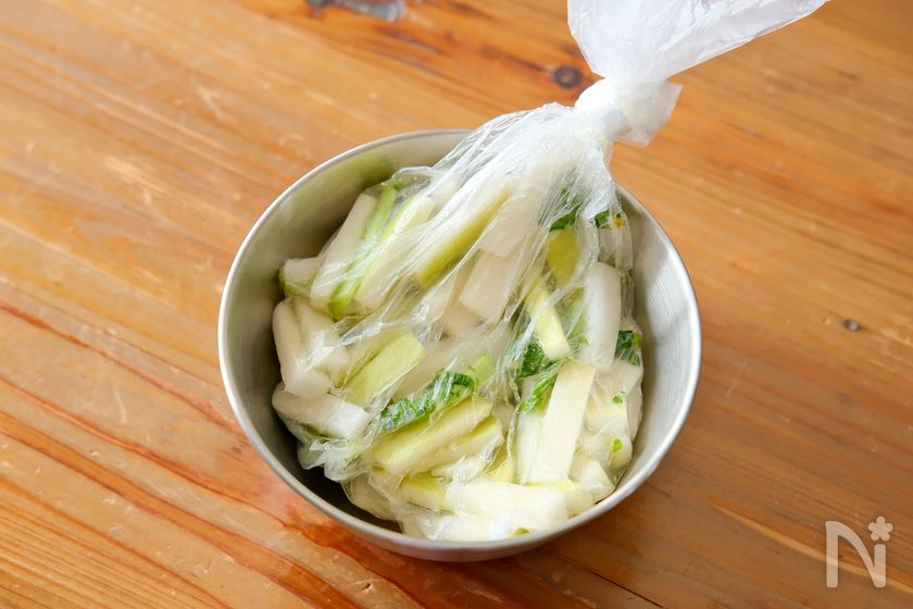 (3) 2、大根の葉、【A】をポリ袋に入れてもみ、空気を抜いて口を閉じる。冷蔵庫でひと晩おく。