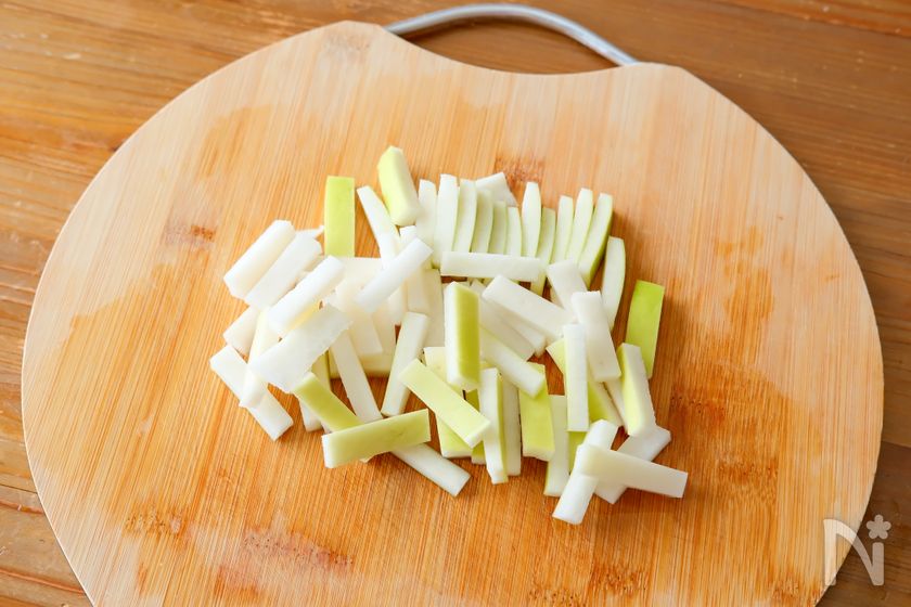 (2) 水洗いして水けを拭き、短冊切りにする。