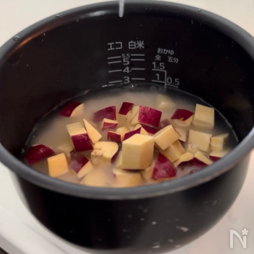 さつまいもを米の上に均等に広げ、通常炊飯する。