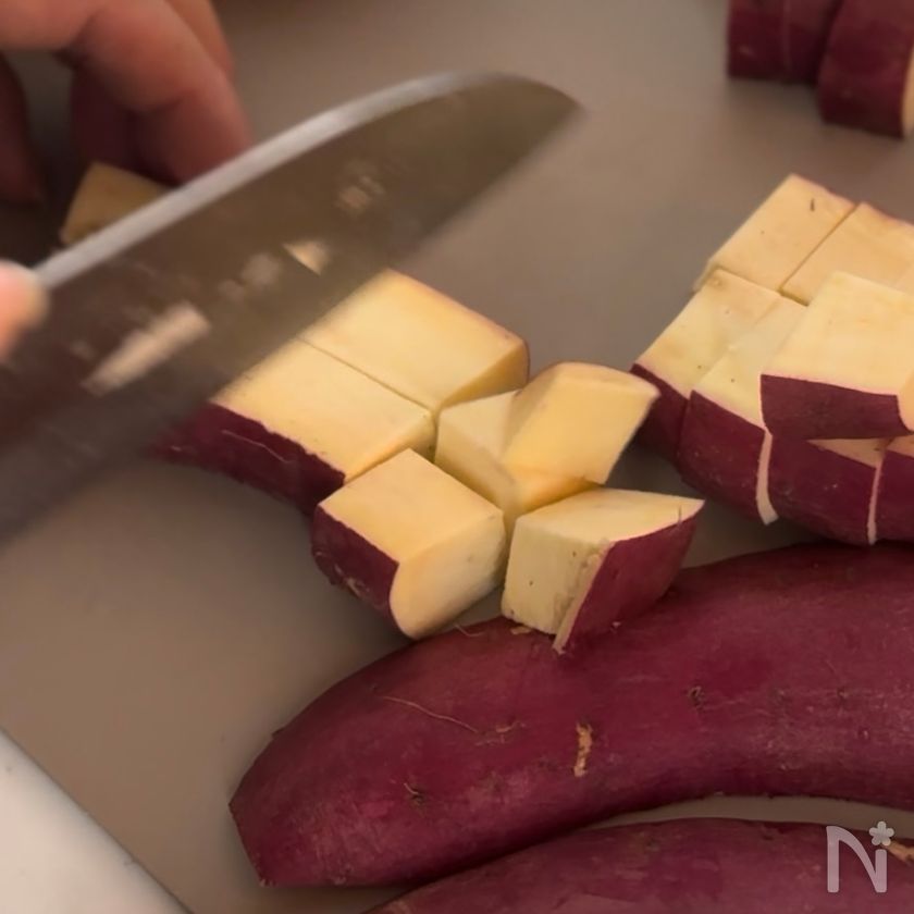 さつまいもは皮付きのまま1cm角に切り、水に5分ほどさらしてアクを抜く。軽くすすいで水気を切る。