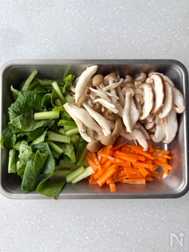 小松菜は3cm長さに切り、にんじんは細切りにする。