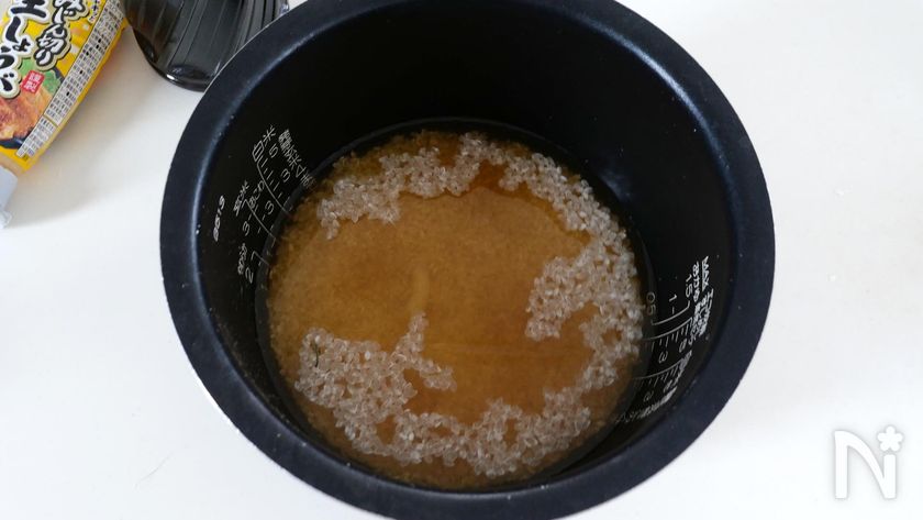 (1) 炊飯釜に洗った米と【A】を入れ、2合の目盛りまで水を入れる。