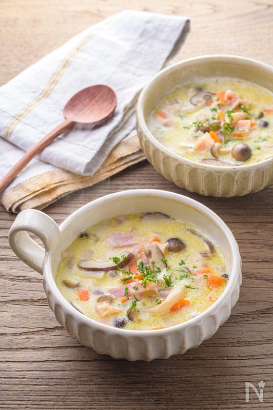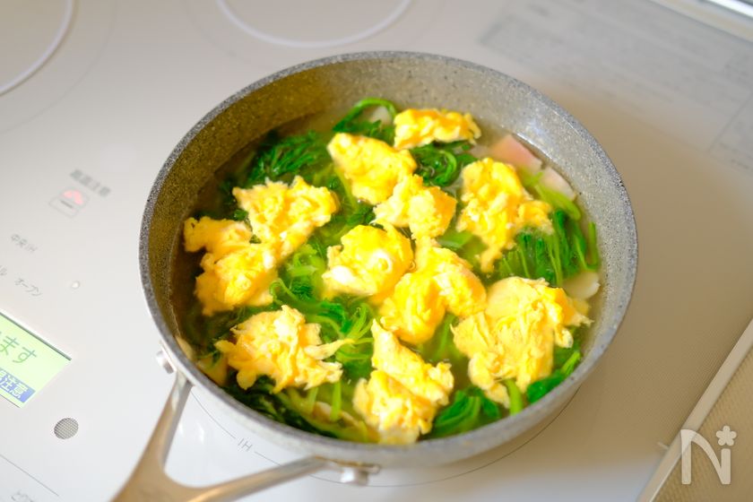 ふわとろ【ほうれん草とベーコンのスクランブルエッグスープ】